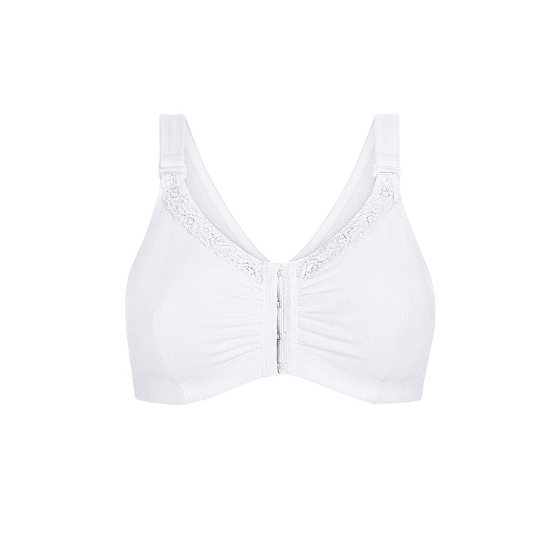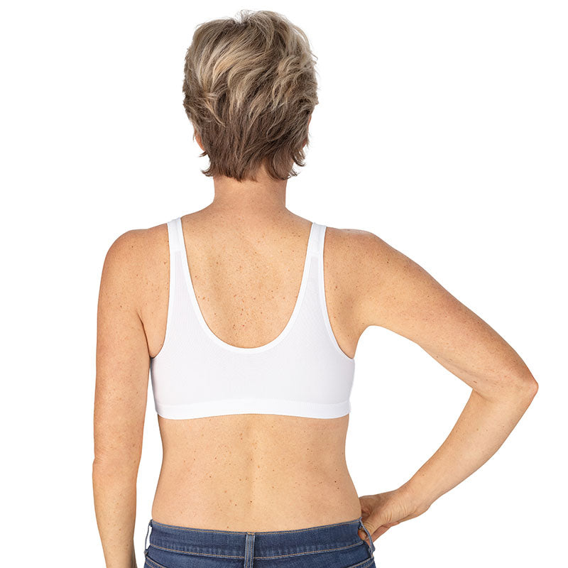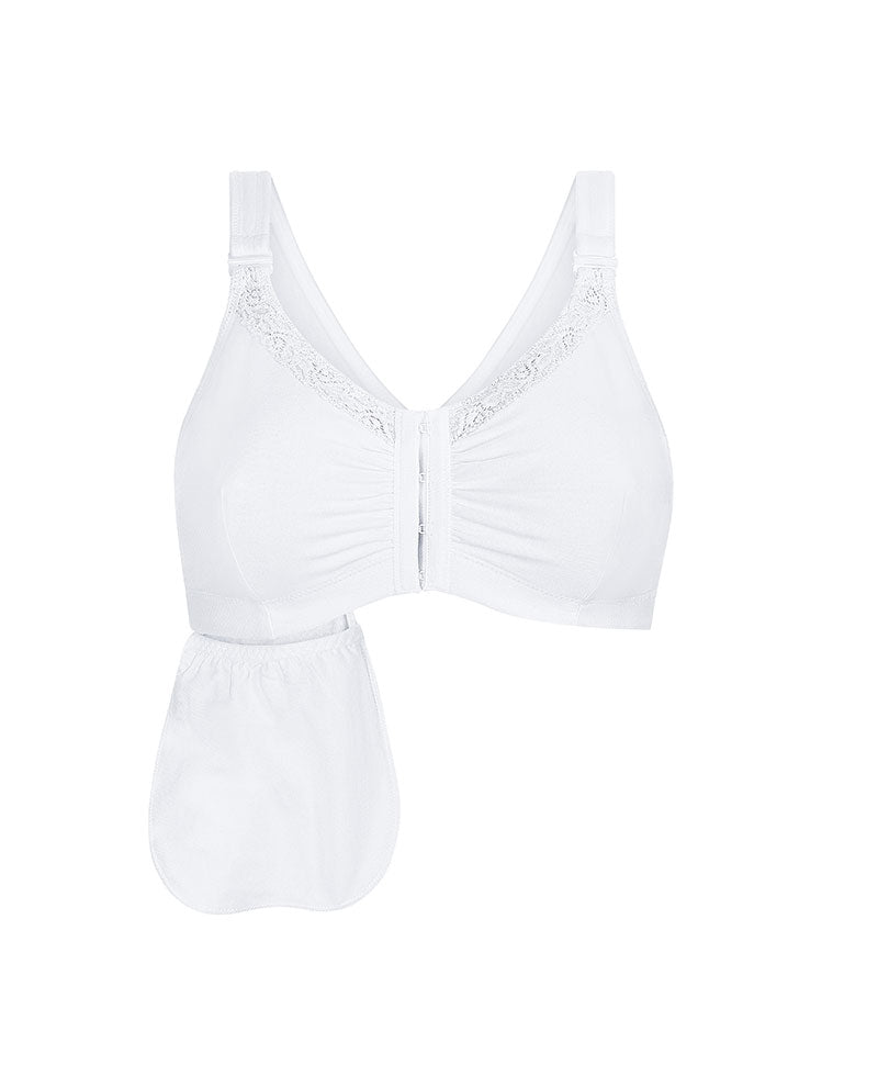 Ultra-soft fabric offers a snug and non-restrictive fit. Post surgery front closure bra for easy access during treatment with cut and sewn cotton pockets and smooth interior side seams for comfort to sensitive skin. Padded, stretch fabric straps with front fasteners.