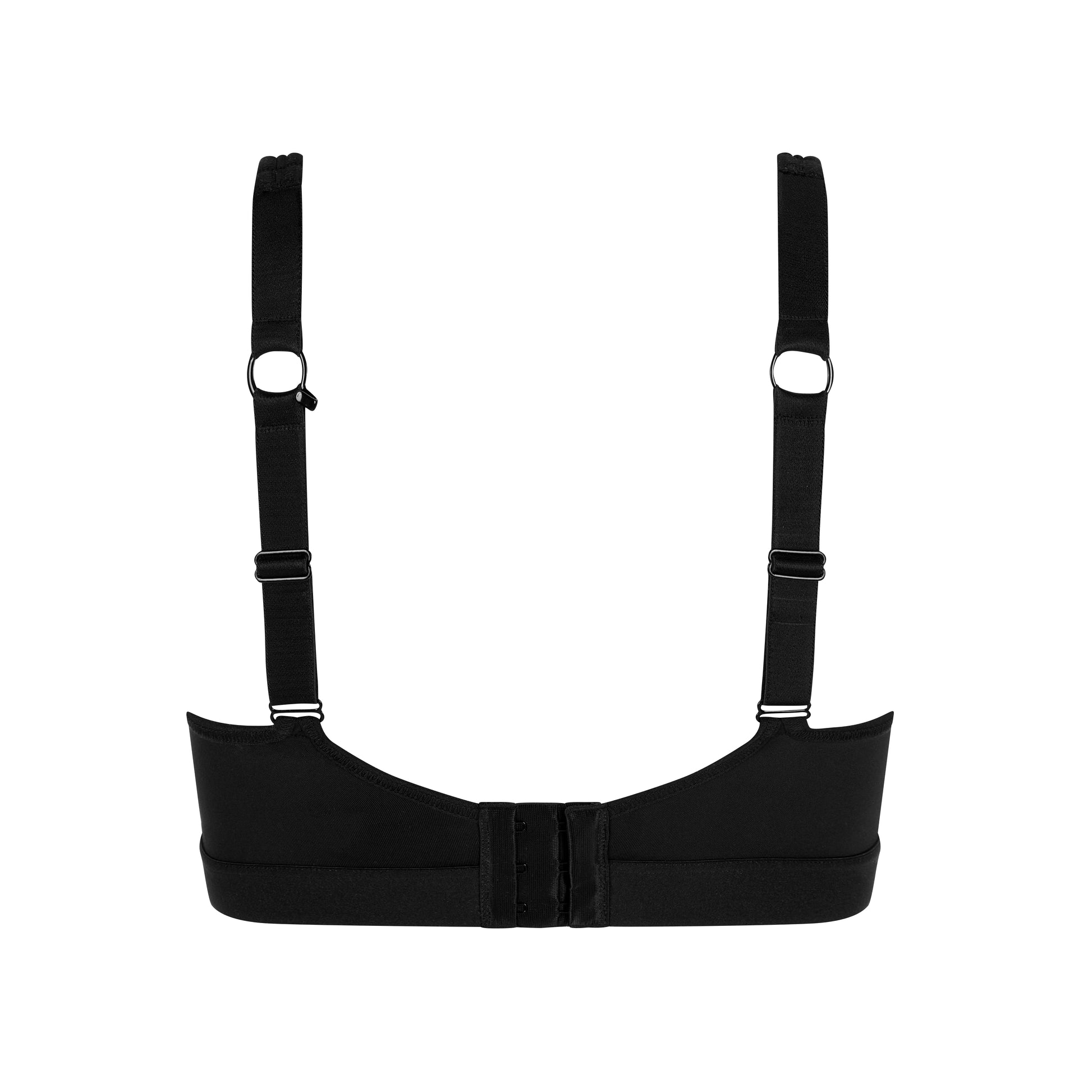 Higher coverage of side and back parts, wider underbust band and soft padded back closures for even higher wearing comfort, wider padded front straps for shoulder relief