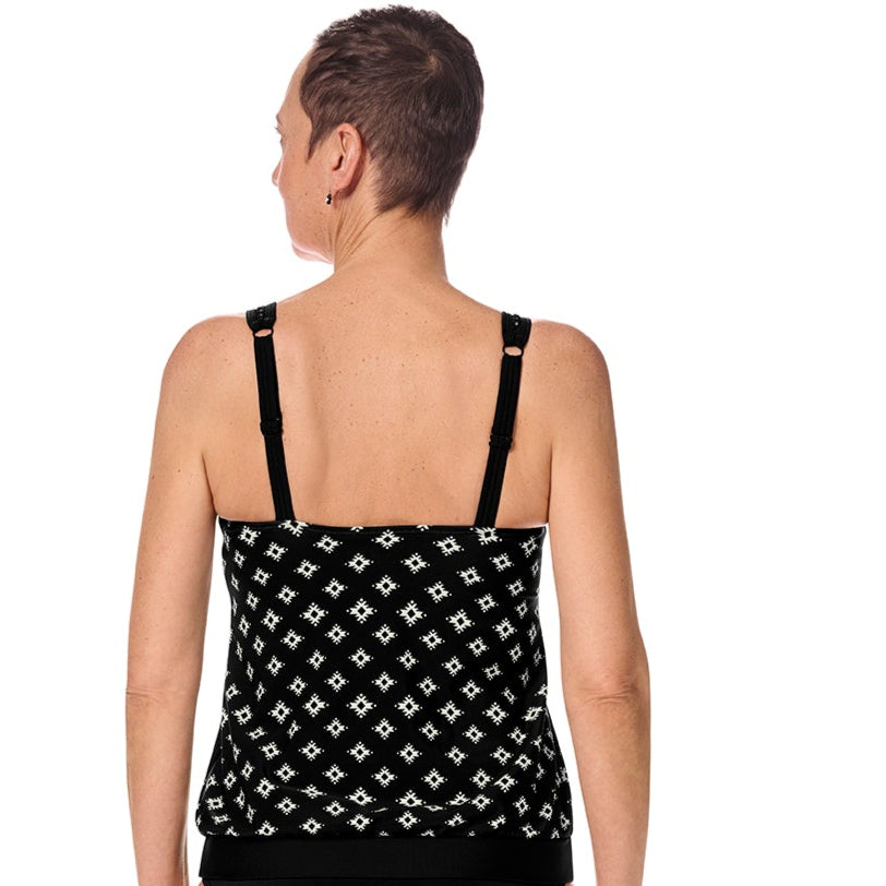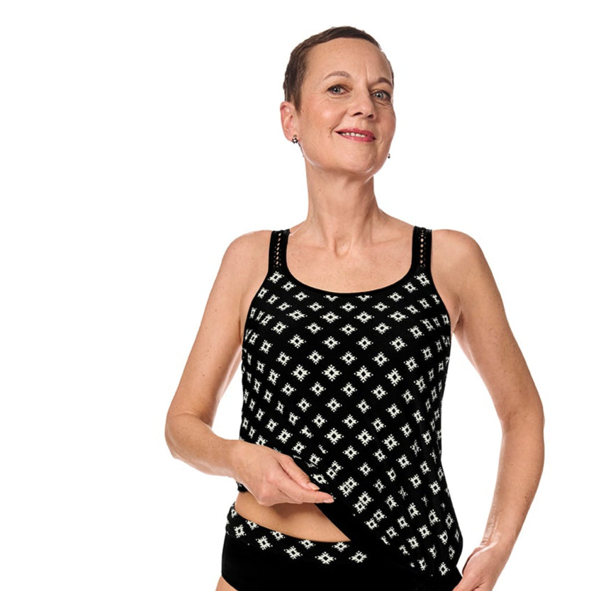 Experience the beauty and versatility of the Palermo Blouson Mastectomy Inclusive Top, made from durable, comfortable LYCRA® XTRA LIFE™. Designed with integrated pockets, padded cups, and Amoena Wave Seam Technology, this swim top not only offers excellent support for breast forms and shapers, but also subtly conceals any unevenness. Stay protected and confident with its UV protection (50+) and flattering cut. Plus, adjustable back straps and a wider front ensure optimal comfort and shoulder support. Complete your perfect poolside look with coordinating bikini bottoms, available now.