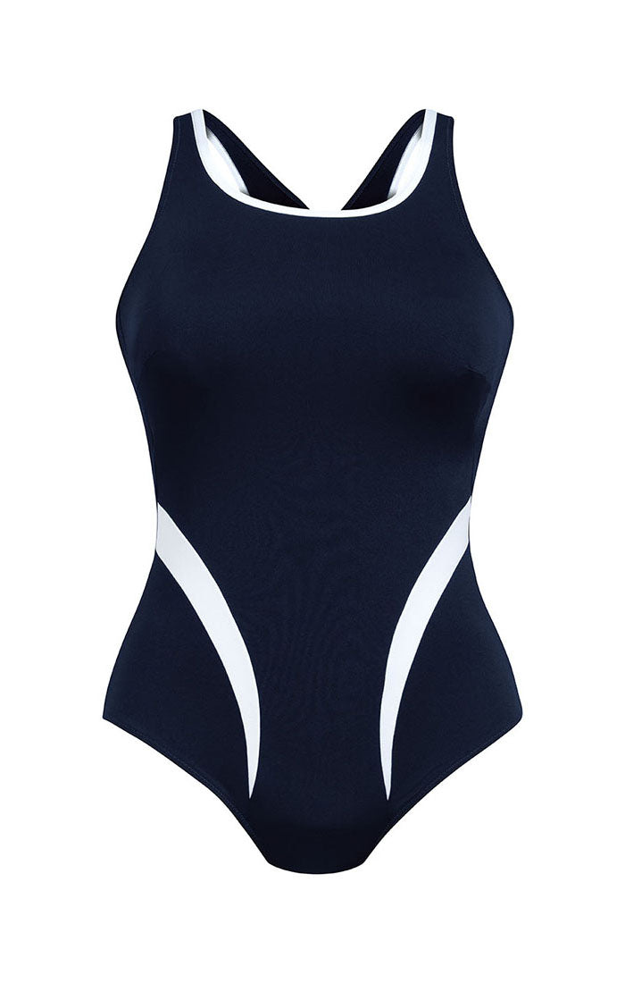 The Padilla mastectomy swimsuit is both functional and fashionable. Its stylish crossback design and high neckline create a sexy look, while the flattering lines offer a slimming effect. The contrasting white inserts and edging add a touch of elegance to complete the design. This swimsuit is perfect for sporty and stylish women in the water.